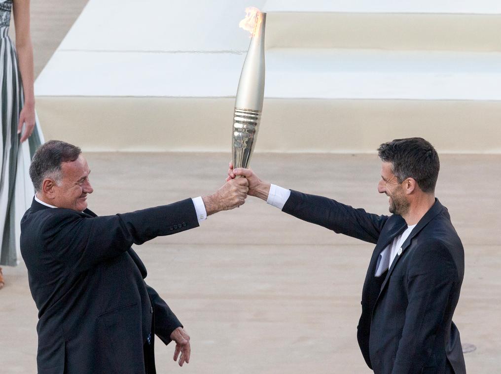 4月26日,巴黎奧組委主席埃斯坦蓋(左)將巴黎奧運(yùn)會火種燈交給工作人員。新華社發(fā)(馬里奧斯·羅洛斯攝)