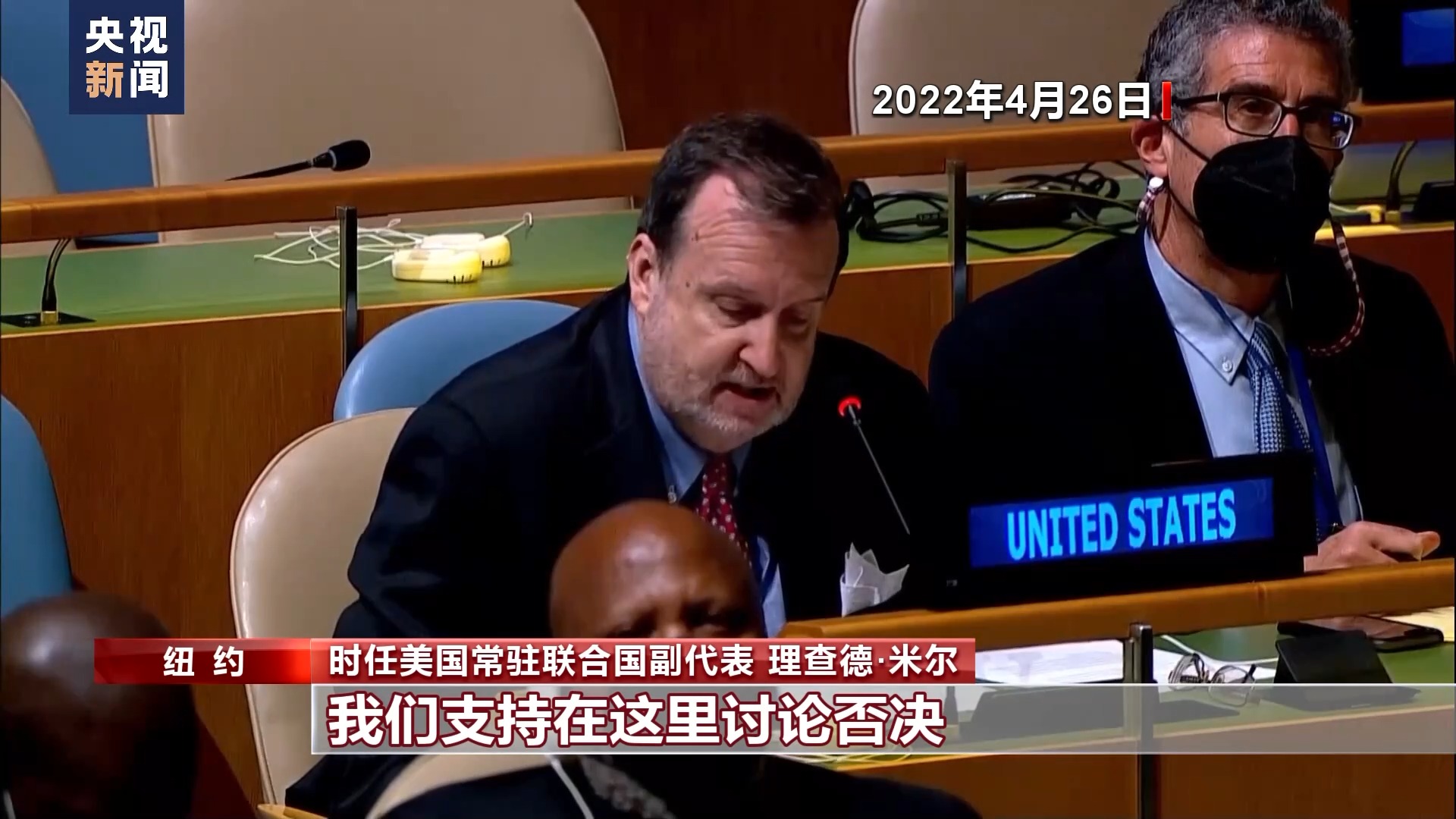 央視記者 徐德智:我們知道所謂聯(lián)大“否決倡議”,是在2022年4月通過的名為“在安全理事會發(fā)生投否決票情況時進行大會辯論的長期授權”的決議。當時俄烏沖突爆發(fā),安理會關于烏克蘭決議幾乎都會被俄羅斯否決,于是美國支持了這個“要求安理會決議否決國家必須到聯(lián)大解釋原因”的提案。當年美國代表團可不是這么說的。