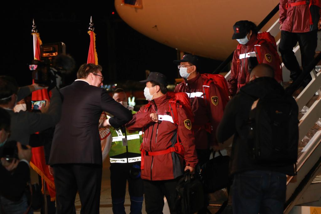 2020年3月21日,在塞爾維亞首都貝爾格萊德,前來迎接的塞爾維亞總統(tǒng)武契奇(左)與中國援助塞爾維亞抗疫醫(yī)療專家組成員“碰肘”致意。新華社記者石中玉攝