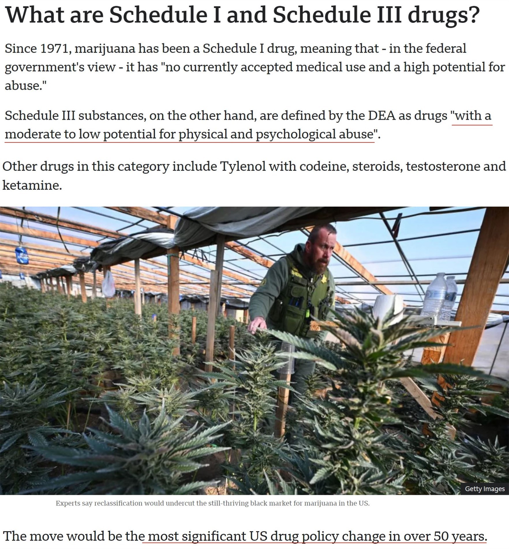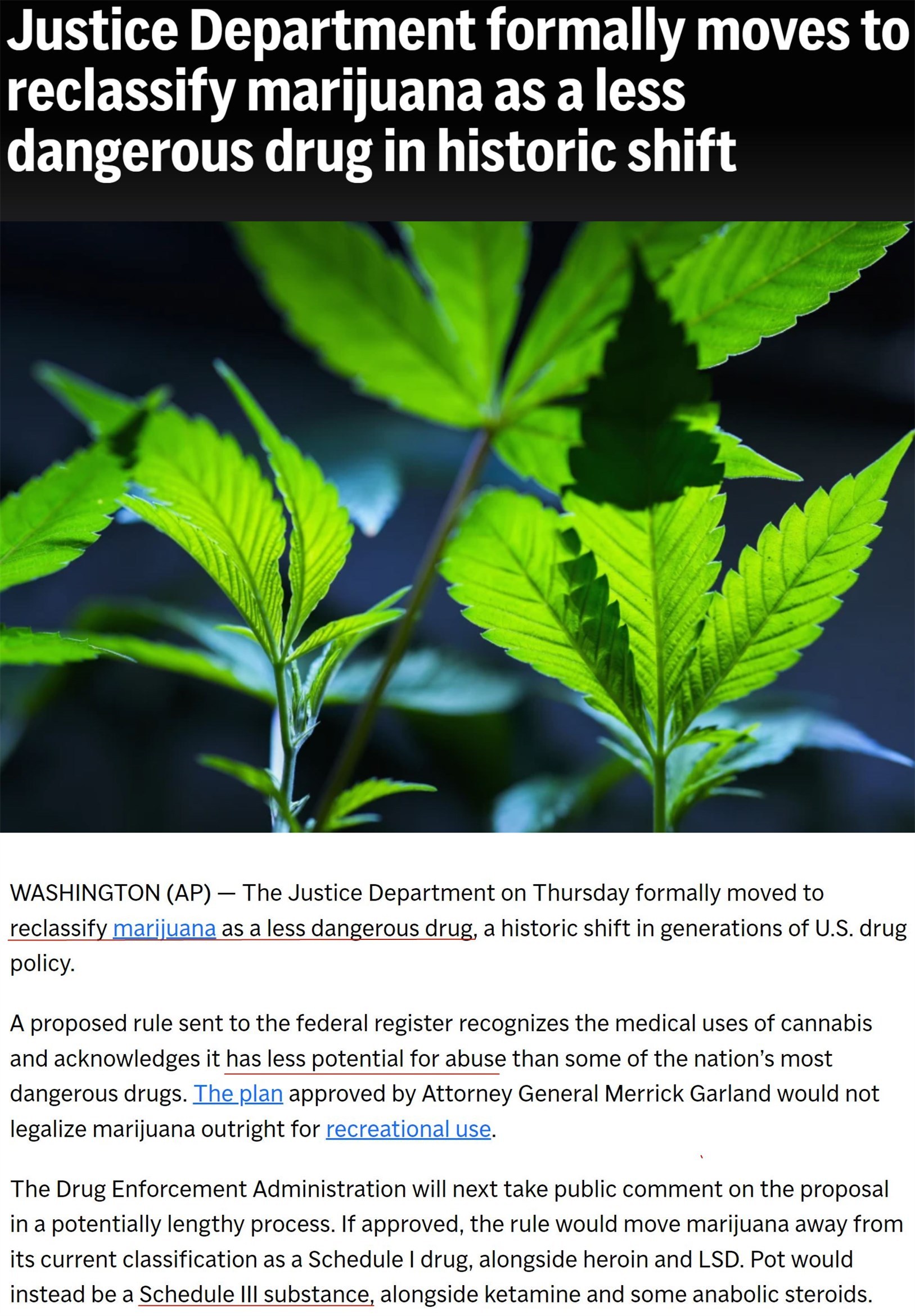 如果經(jīng)過(guò)60天的公眾意見征詢期后最終獲批,新規(guī)則雖然不會(huì)在聯(lián)邦層面將大麻完全合法化,但會(huì)將其移出《美國(guó)聯(lián)邦管制物質(zhì)法案》中列管海洛因等最危險(xiǎn)毒品的“附表一”,轉(zhuǎn)而歸入列管氯胺酮和類固醇等危險(xiǎn)性較低藥物的“附表三”。