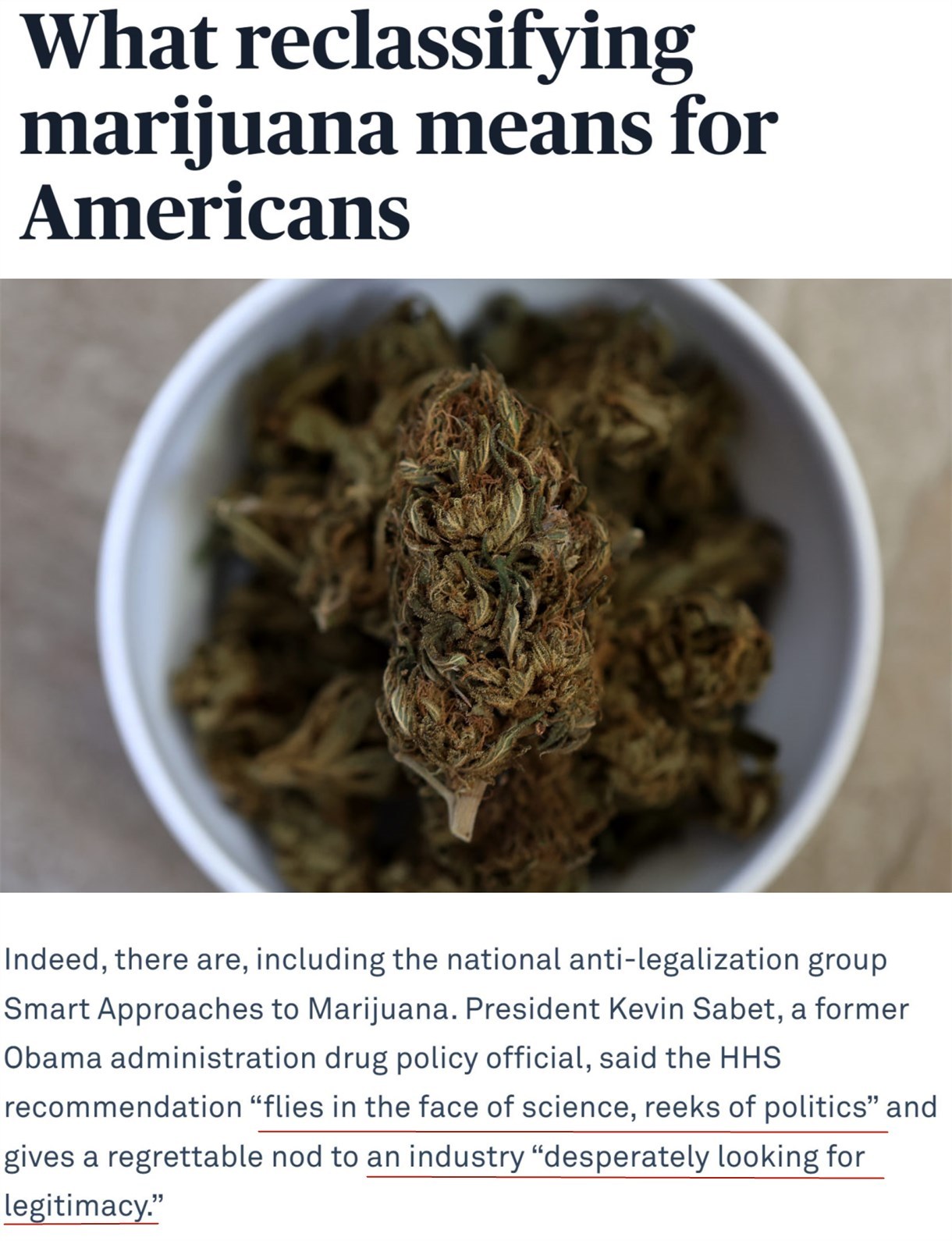前白宮毒品政策官員凱文·薩比特批評(píng)稱,此舉“公然藐視科學(xué),帶有政治意味”,等于是承認(rèn)了一個(gè)“拼命尋求合法性”的行業(yè)。