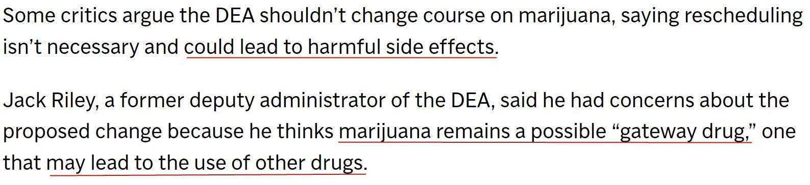 美國(guó)禁毒署前副署長(zhǎng)杰克·萊利對(duì)擬議中的規(guī)則更改感到擔(dān)憂。他認(rèn)為,大麻仍是一種“入門毒品”,可能導(dǎo)致對(duì)其他毒品的使用。