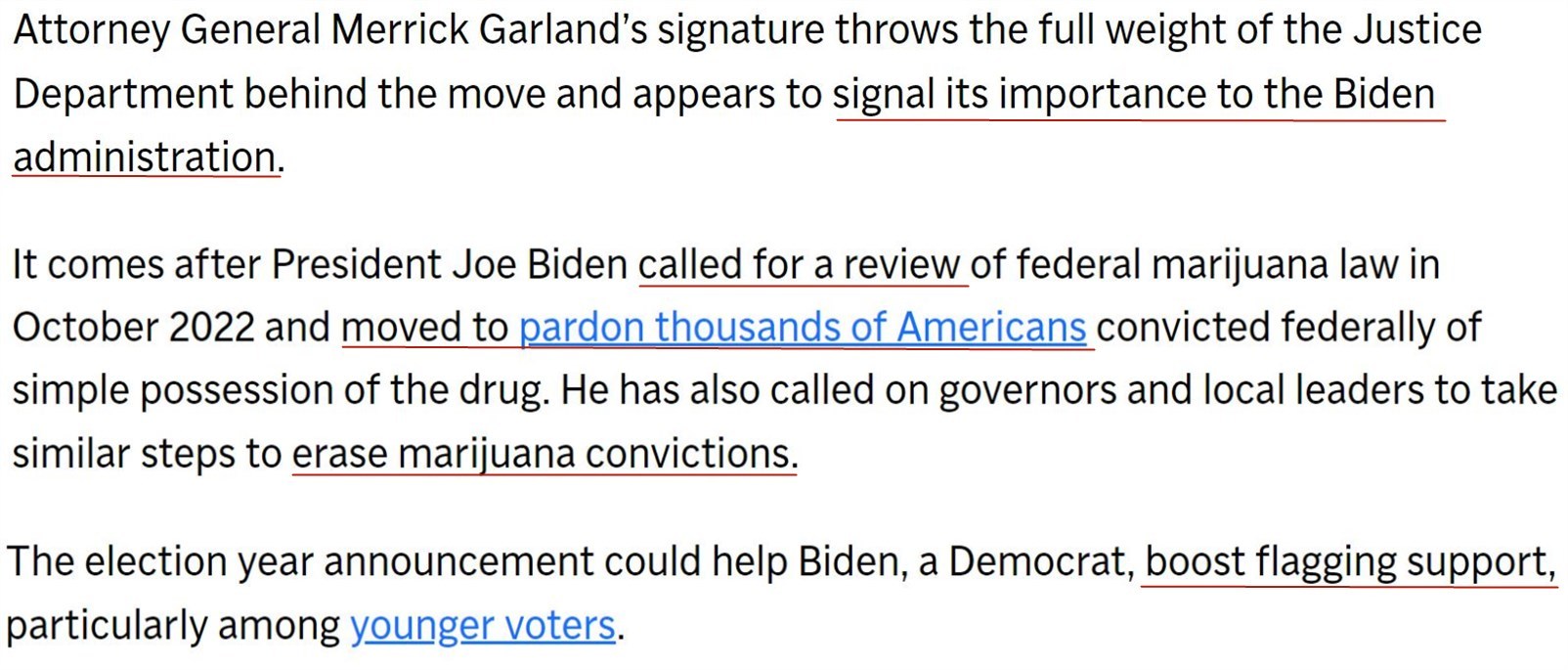 美聯(lián)社分析指出,美司法部對(duì)修改大麻分類的全力支持,表明了此舉對(duì)拜登政府的重要性。拜登在大選前夕推動(dòng)大麻去罪化,就是為了吸引年輕選民的支持。