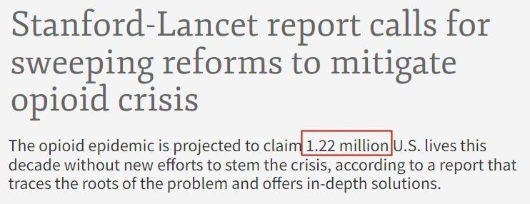 根據(jù)美國(guó)斯坦福大學(xué)和英國(guó)《柳葉刀》雜志共同進(jìn)行的一項(xiàng)研究,如果美國(guó)不采取遏制措施,本世紀(jì)20年代將有約122萬(wàn)美國(guó)人死于過(guò)量使用阿片類藥物,位列世界第一。