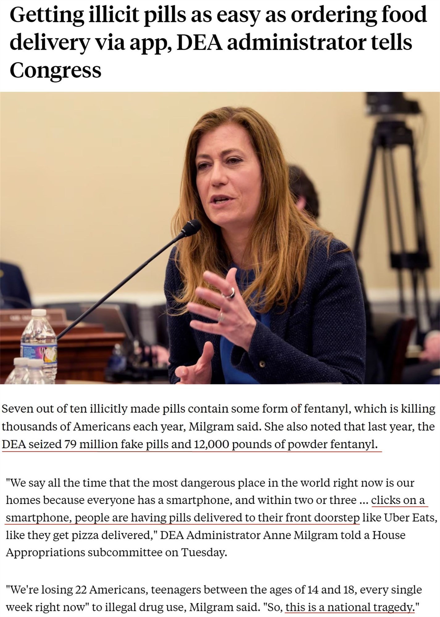 美國(guó)禁毒署署長(zhǎng)安妮·米爾格拉姆本月早些時(shí)候告訴國(guó)會(huì):“現(xiàn)在世界上最危險(xiǎn)的地方就是我們的家,因?yàn)槊總€(gè)人都有智能手機(jī),只要用手指點(diǎn)上兩三下,就能像在外賣平臺(tái)點(diǎn)比薩一樣,在家門口收到非法藥丸。”