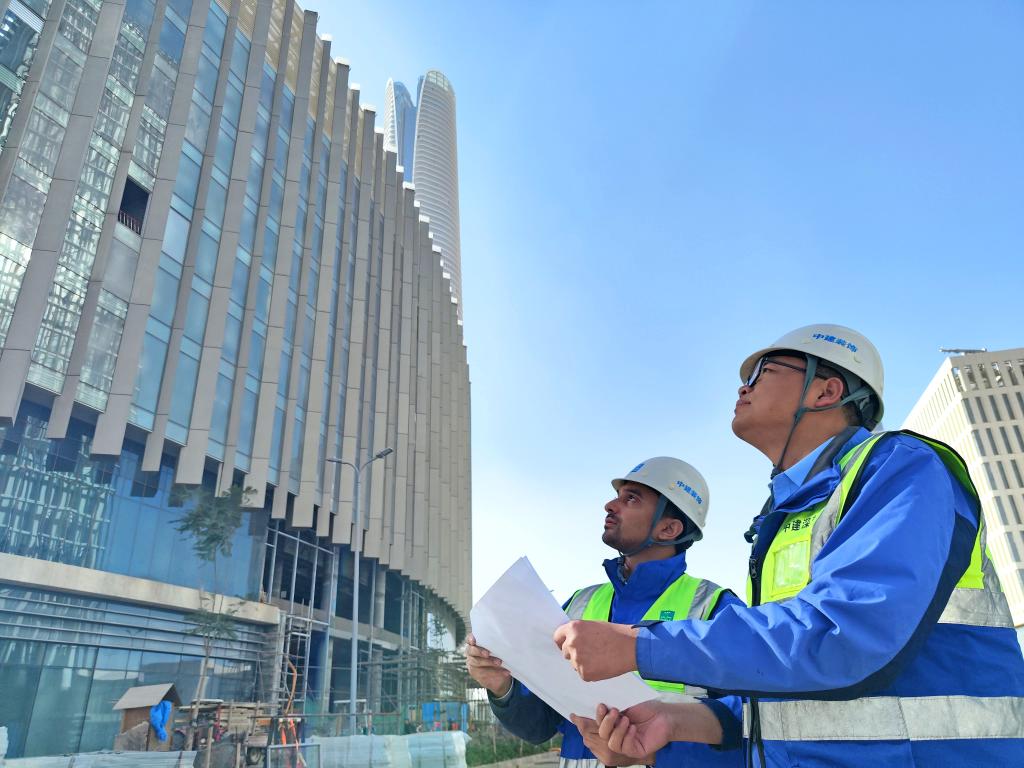2023年11月27日,中建深圳裝飾有限公司項目經(jīng)理徐笑笑(右)與來自埃及的幕墻工程師艾哈邁德·賽義德在埃及開羅以東的埃及新行政首都中央商務區(qū)施工現(xiàn)場一同查看幕墻安裝進度(手機拍攝)。新華社發(fā)(中建深圳裝飾有限公司供圖)
