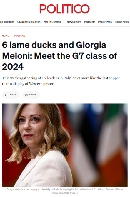 面對各自國內(nèi)嚴峻的政治形勢,本次G7峰會開得真有些力不從心、心猿意馬。法德兩國領(lǐng)導(dǎo)人所在政黨在上周剛剛結(jié)束的歐洲議會選舉中表現(xiàn)堪憂;英國首相蘇納克更在朝不保夕中擔(dān)憂著自己的保守黨會在下月初大選中走到窮途末路;美國總統(tǒng)拜登更是處處遭逢著大選對手特朗普的咄咄逼人。美國政客新聞網(wǎng)歐洲版(Politico.eu)捕捉到了這種有趣的心不在焉的會議氛圍,以《六只跛腳鴨和梅洛尼》為題諷刺總結(jié)本次峰會,“在意大利舉行的七國集團峰會看起來更像是最后的晚餐,而不是西方力量的展示”。
