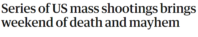 文章指出,周末發(fā)生的一系列大規(guī)模槍擊事件讓美國社會被死亡和混亂的陰影籠罩。在大規(guī)模槍擊案發(fā)生頻率如此之高的背景下,美國民眾呼吁加強(qiáng)槍支管控的聲音日益強(qiáng)烈,但聯(lián)邦政府通常對此無動于衷或無能為力。