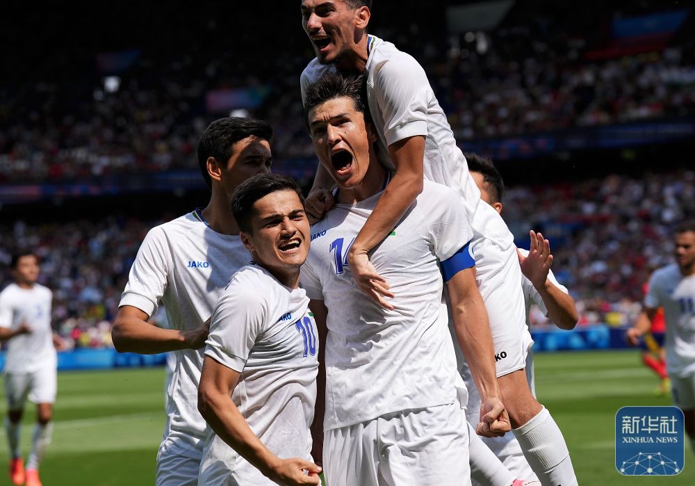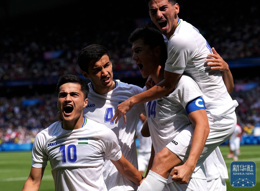 烏茲別克斯坦隊(duì)球員在比賽中慶祝進(jìn)球。新華社記者 李一博 攝