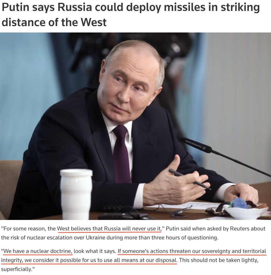 俄總統(tǒng)普京多次強(qiáng)調(diào),出于某種原因,西方認(rèn)為俄羅斯永遠(yuǎn)不會(huì)使用核武器,但俄羅斯有自己的核原則。