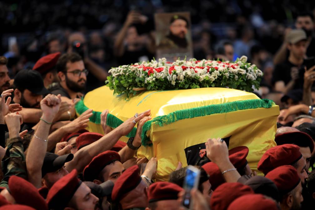 8月1日,在黎巴嫩首都貝魯特,真主黨成員參加真主黨高級(jí)軍事指揮官福阿德·舒庫爾的葬禮。新華社發(fā)(比拉爾·賈維希攝)