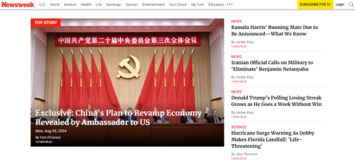 2024年8月2日,駐美國大使謝鋒接受美國《新聞周刊》(Newsweek)高級(jí)外交政策記者湯姆·奧康納專訪,闡釋中國共產(chǎn)黨二十屆三中全會(huì)精神。訪談內(nèi)容8月5日在該周刊網(wǎng)站頭版頭條刊登。主要內(nèi)容如下: