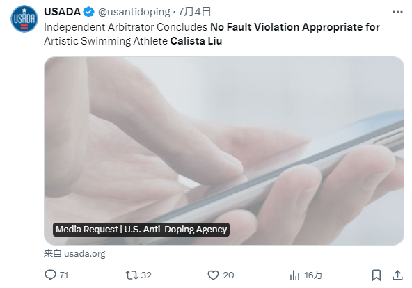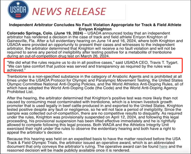 這屆奧運(yùn)會,享受了美國這項(xiàng)“服務(wù)”的除了花游運(yùn)動員卡莉斯塔,還有田徑運(yùn)動員埃里揚(yáng)·奈頓。他們分別在5月和3月藥檢陽性,但巧的是,美國官方對這兩人的脫罪聲明都是卡在奧運(yùn)會前發(fā)出,“及時”地保住了他們的參賽資格,然后美國反興奮劑機(jī)構(gòu)官網(wǎng)又“及時”地把聲明刪掉了。