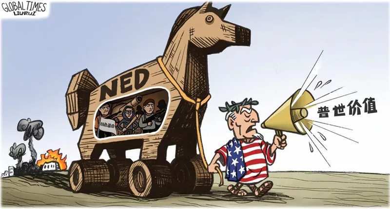 長期以來,美國將所謂普世價值工具化、武器化,煽動分裂對抗,干涉別國內(nèi)政,造成災難性后果。NED就是美國政府禍亂別國的“特洛伊木馬”。圖源:《環(huán)球時報》