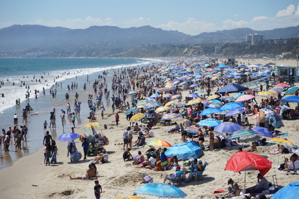 6月23日,人們?cè)诿绹?guó)加利福尼亞州洛杉磯圣莫尼卡海灘休閑避暑。新華社發(fā)(曾慧攝)