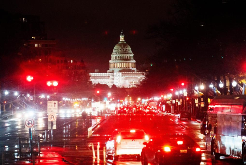 這是2022年12月22日在美國華盛頓拍攝的雨中的車輛和國會大廈。新華社記者劉杰攝