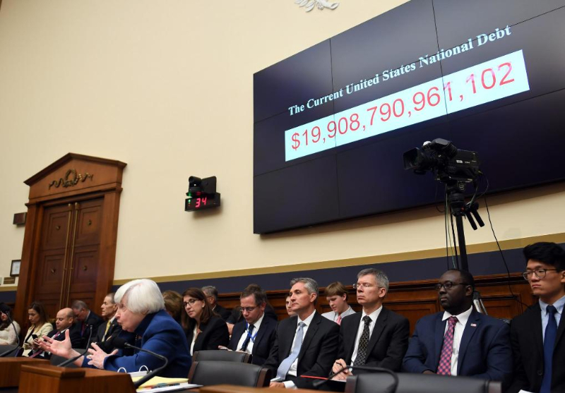 2017年7月12日,時任美國聯邦儲備委員會主席耶倫(前)在華盛頓出席國會聽證會,屏幕顯示美國當時的國債近20萬億美元。新華社記者殷博古攝