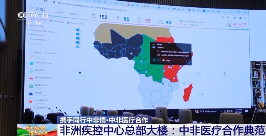 在位于非洲疾控中心八層的應(yīng)急指揮大廳里,巨大的顯示屏顯示著新型冠狀病毒、猴痘、埃博拉、登革熱等傳染病數(shù)據(jù),配套設(shè)置有數(shù)據(jù)采集系統(tǒng),可以讓疾病數(shù)據(jù)第一時間上傳到應(yīng)急指揮大廳,確保數(shù)據(jù)實(shí)時更新,為疾控決策提供依據(jù)。