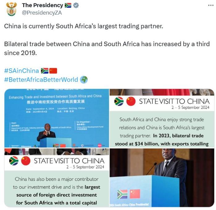 南非總統(tǒng)官方賬號也在峰會期間發(fā)文稱,中國目前是南非最大的貿易伙伴,南非和中國擁有充滿活力、多元和不斷增長的經(jīng)濟,能夠為希望開拓新市場的企業(yè)提供豐富機遇。