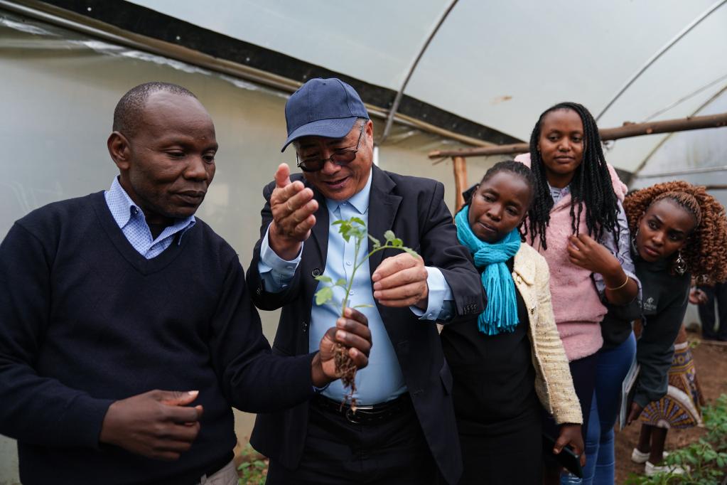 2023年9月18日,在肯尼亞納庫魯郡舉辦的中非農(nóng)業(yè)發(fā)展和減貧示范村番茄生產(chǎn)培訓班上,來自中國的農(nóng)學教授劉高瓊(左二)為肯方學員指導農(nóng)業(yè)技術。新華社記者 韓旭 攝