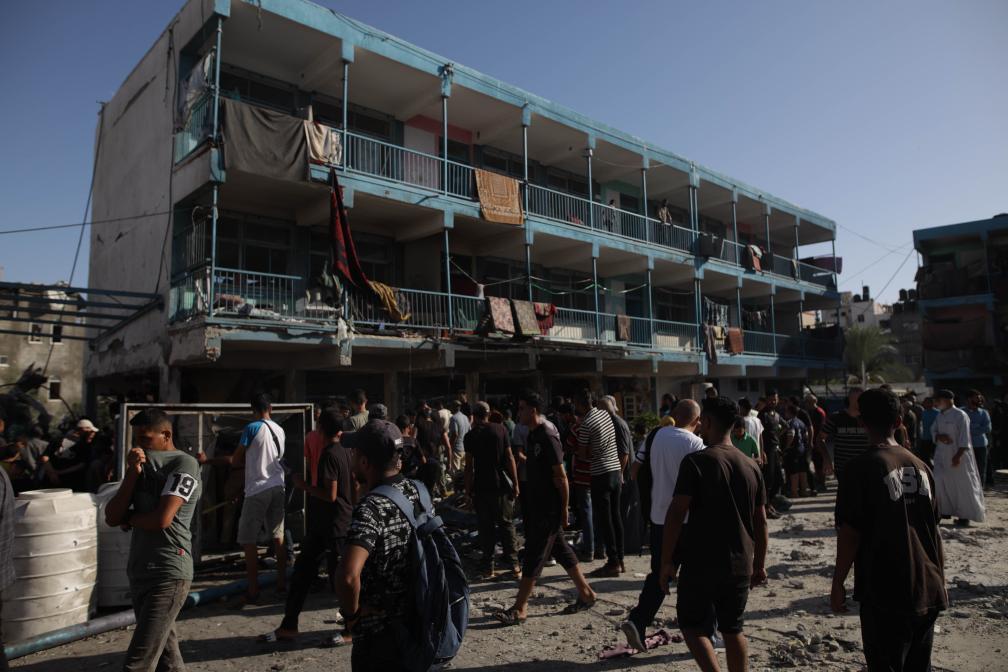 9月11日,在加沙地帶中部努賽賴特難民營,人們聚集在以軍轟炸后的學(xué)校廢墟附近。新華社發(fā)(馬爾萬·達(dá)烏德攝)