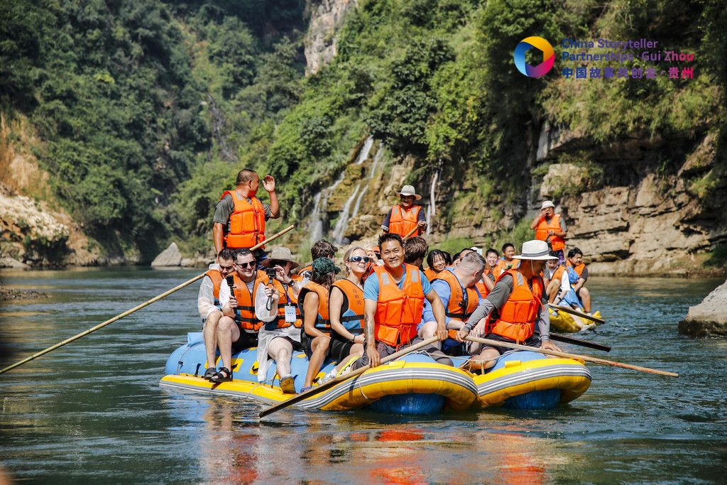 2024中國故事共創(chuàng)會(huì)“外籍網(wǎng)紅貴州行”采訪團(tuán)外籍成員在興義市馬嶺河峽谷體驗(yàn)漂流。
