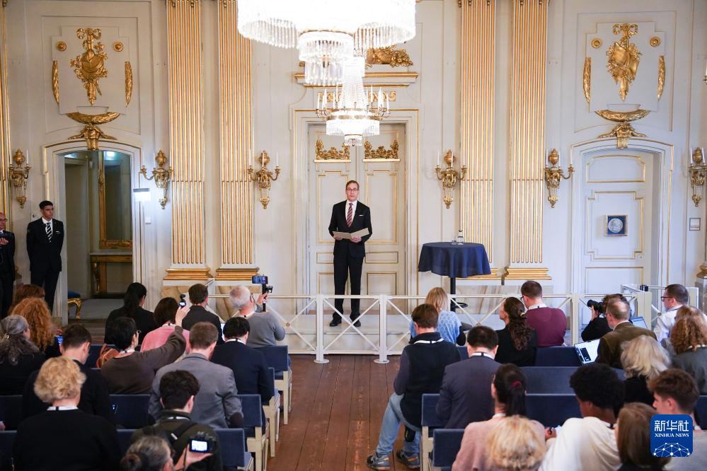 10月10日,瑞典文學(xué)院常任秘書馬茨·馬爾姆在斯德哥爾摩舉行的新聞發(fā)布會上揭曉獲獎(jiǎng)?wù)?。新華社記者 彭子洋 攝