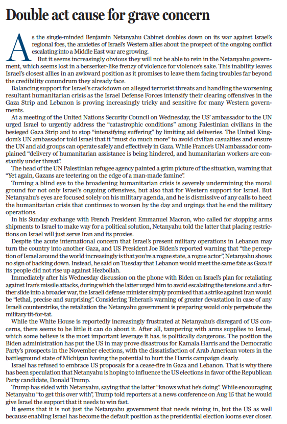 對(duì)不斷擴(kuò)大的人道主義危機(jī)視而不見,不僅嚴(yán)重?fù)p害了以色列軍事行動(dòng)的道德基礎(chǔ),也損害了美國和西方支持以色列的道德基礎(chǔ)。內(nèi)塔尼亞胡眼里只有軍事議程,對(duì)任何要求他關(guān)注人道主義危機(jī)、結(jié)束軍事行動(dòng)的呼聲都置之不理,不屑一顧。