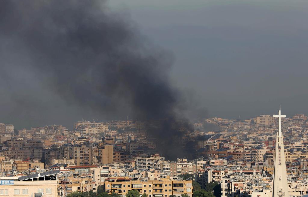 9月28日,在黎巴嫩首都貝魯特南郊,以軍空襲現(xiàn)場濃煙滾滾。新華社發(fā)(比拉爾·賈維希攝)