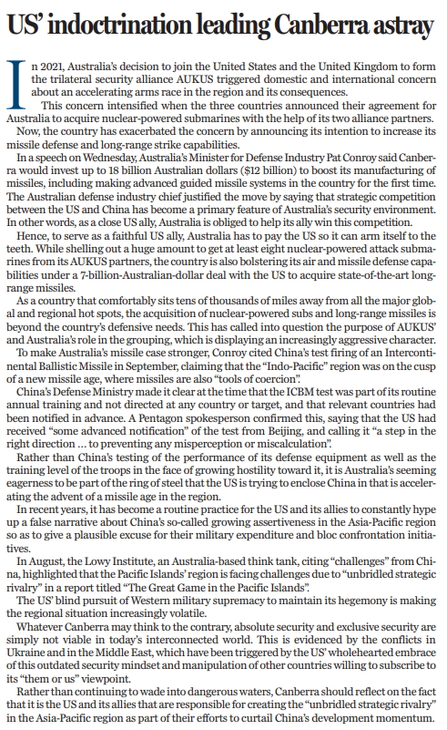 作為一個遠(yuǎn)離全球和地區(qū)主要熱點(diǎn)的國家,購買核動力潛艇和遠(yuǎn)程導(dǎo)彈超出了澳大利亞的防御需要。這不禁令人對“奧庫斯”的目的以及澳大利亞在其中的作用產(chǎn)生疑問,因?yàn)椤皧W庫斯”表現(xiàn)出越來越強(qiáng)的攻擊性。