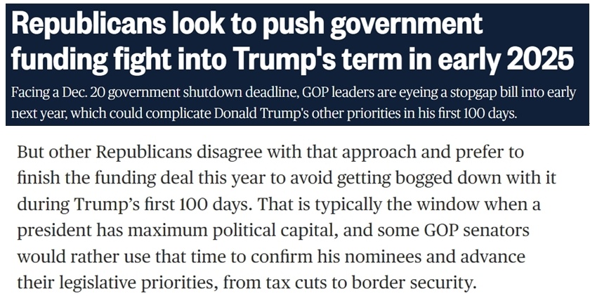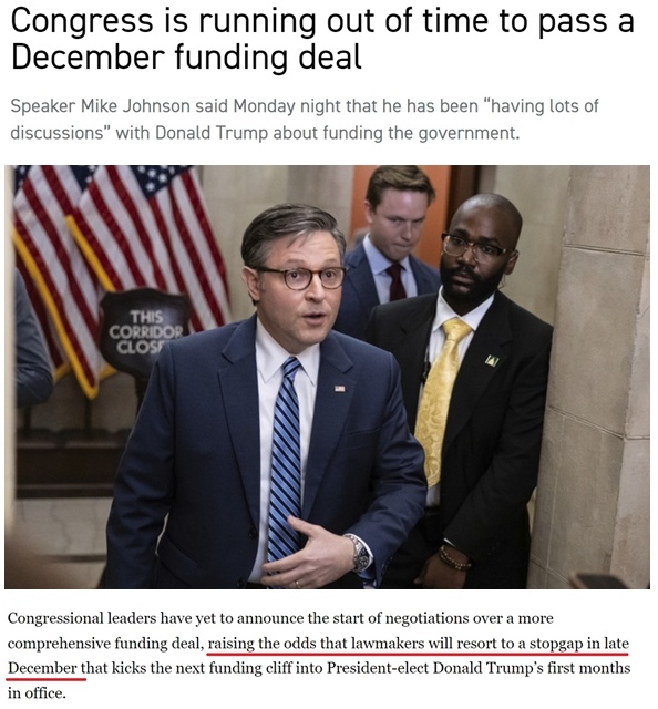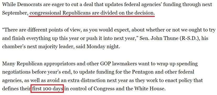 據(jù)報道,不少共和黨議員、特別是負責撥款的議員希望在年底前完成新財年的總預(yù)算支出談判,避免給特朗普的新政府明年上任后制定政策時帶來額外干擾,因為這些政策將“決定他們控制國會和白宮的頭100天”。