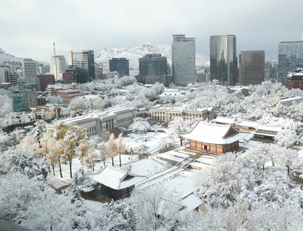 這是11月27日拍攝的韓國首都首爾市中心的雪景。新華社記者姚琪琳攝