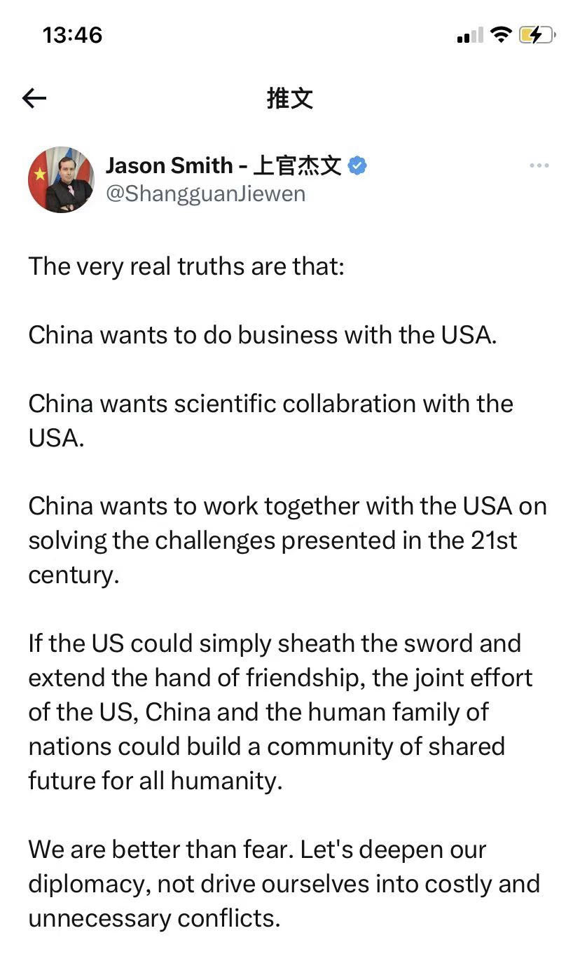 他在推特中稱,“真正的事實(shí)是,中國(guó)愿意與美國(guó)做買賣、進(jìn)行科學(xué)合作,并共同解決21世紀(jì)面臨的挑戰(zhàn)。如果美國(guó)能夠停止敵對(duì)行動(dòng),并伸出友誼之手,中美兩國(guó)和全人類大家庭可以共同努力構(gòu)建人類命運(yùn)共同體。我們比恐懼更強(qiáng)大,讓我們深化外交關(guān)系,避免陷入代價(jià)高昂且不必要的沖突中?!?/p>