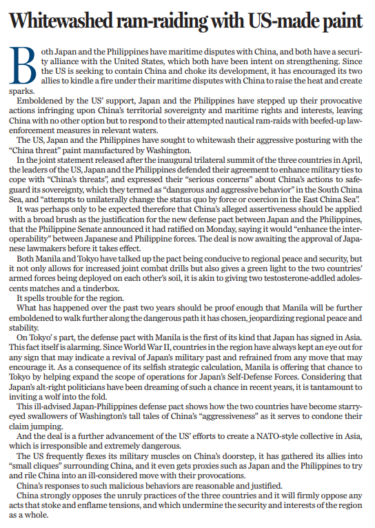 這一不明智的日菲防務(wù)協(xié)定表明,這兩個國家已經(jīng)盲目聽信美國編造的所謂中國“咄咄逼人”的論調(diào),并以此為借口為其攫取權(quán)益的行為開脫。