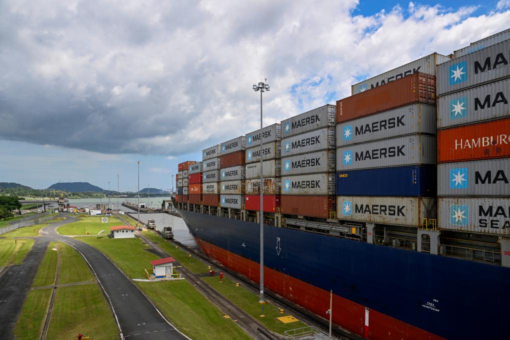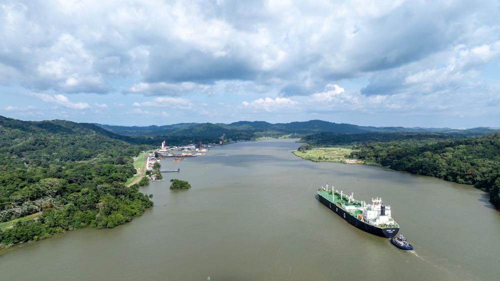 8月28日,在巴拿馬首都巴拿馬城附近,一艘貨輪通過巴拿馬運(yùn)河的米拉弗洛雷斯船閘準(zhǔn)備駛?cè)胩窖?。新華社記者李木子攝