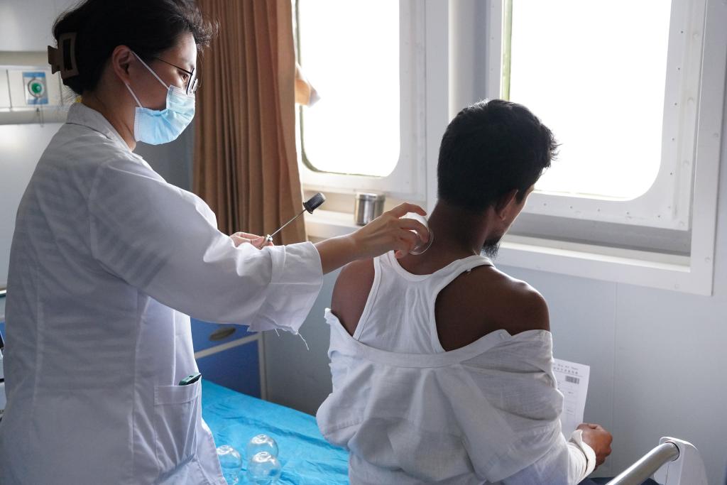 2024年12月24日,在斯里蘭卡科倫坡港,中國(guó)海軍“和平方舟”號(hào)醫(yī)院船上的醫(yī)生為19歲的小伙穆賈希德拔火罐。(新華社記者伍岳攝)