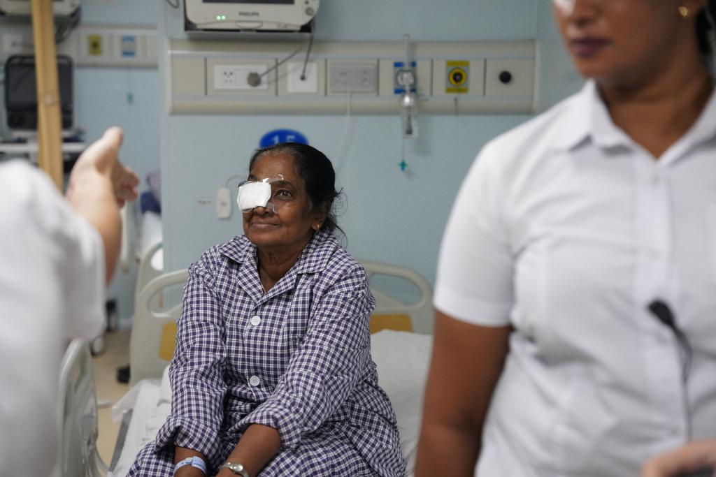 這是2024年12月24日在斯里蘭卡科倫坡港停靠的中國(guó)海軍“和平方舟”號(hào)醫(yī)院船上拍攝的剛進(jìn)行完白內(nèi)障手術(shù)的本地患者。(新華社記者伍岳攝)