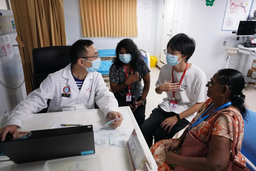 2024年12月24日,在斯里蘭卡科倫坡港,中國(guó)海軍“和平方舟”號(hào)醫(yī)院船上的醫(yī)生在志愿者的幫助下對(duì)當(dāng)?shù)鼗颊哌M(jìn)行問(wèn)診。(新華社記者伍岳攝)