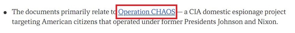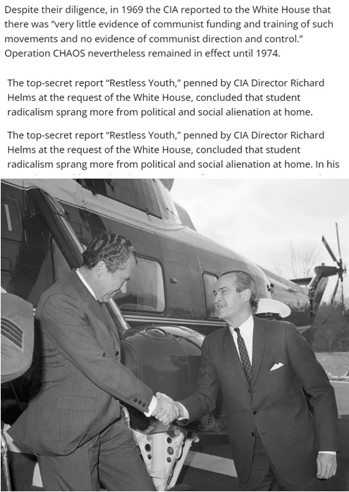盡管搞得如此煞有介事,但中情局早在1969年(“混沌行動”實施兩年后)就向白宮報告稱,“幾乎沒有證據表明這些運動受到了外國勢力的資助、訓練、指導和控制”。