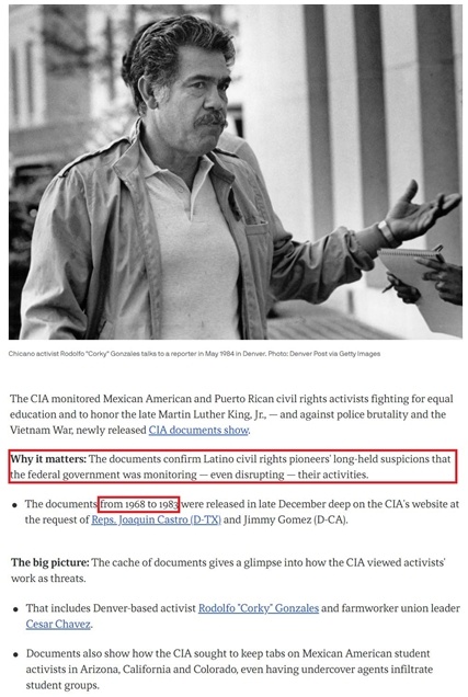 文件揭示,從1968年到1983年,中情局一直在監(jiān)聽、監(jiān)視魯道夫·“科基”·岡薩雷斯和塞薩爾·查韋斯等美國拉美裔民權活動人士的一舉一動。他們均長期致力于要求實現平權和消除貧困。