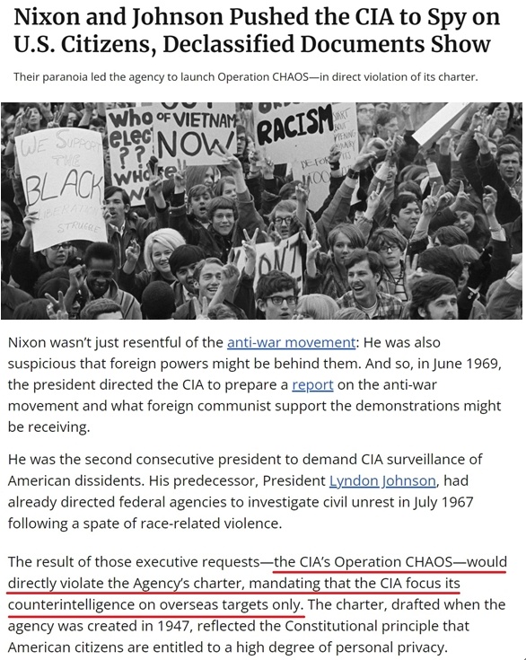 繼任的尼克松進一步擴大了“混沌行動”,并于1969年6月明確指示中情局準備一份關于美國國內反戰(zhàn)運動以及這些運動可能得到“外國支持”的報告。