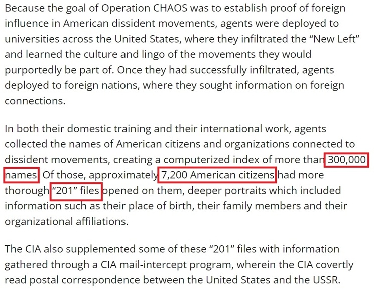 據悉,經過這些“努力”,中情局收集了30多萬個與國內民權運動有關的美國公民和組織的名字。其中約有7200名美國人被建立了更全面的所謂“201”檔案,涉及他們的出生地、家庭成員和組織隸屬關系等各種信息。
