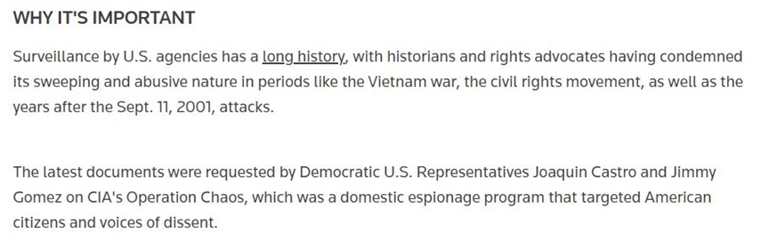 正如路透社所說,美國政府機構的監(jiān)聽監(jiān)視行為歷史悠久,歷史學家和民權倡導人士在越南戰(zhàn)爭時期、民權運動時期以及“9·11事件”發(fā)生后的歲月里,都曾譴責過這種行為的廣泛和濫用性質。