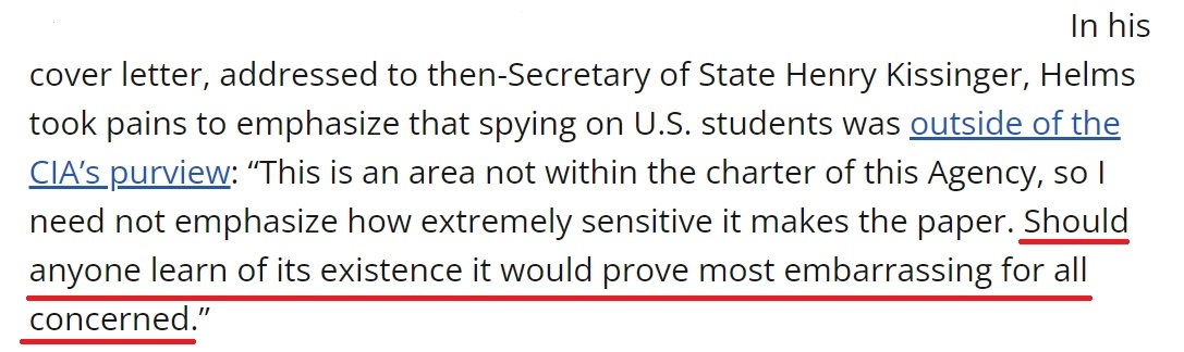 就像時任中情局局長赫爾姆斯1970年在寫給時任國務卿基辛格的信中所說,監(jiān)視美國學生不在中情局的職權范圍內,“如果有人知道了‘混沌行動’的存在,對所有相關者來說都將是非常尷尬的事情”。