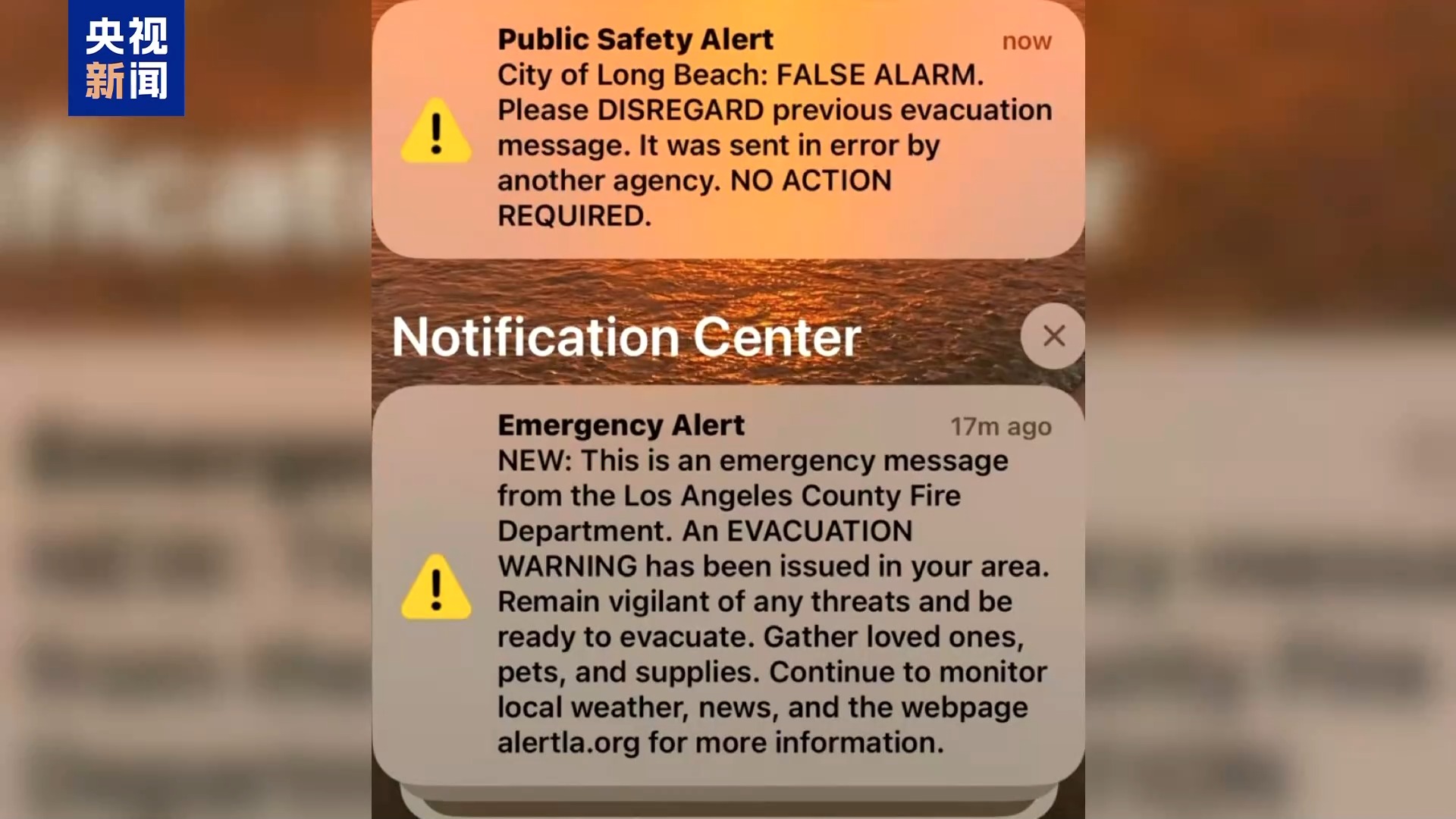 央視記者 劉驍騫:與此同時(shí),根據(jù)我在一線的觀察,人為造成的災(zāi)害正在出現(xiàn)。首先,洛杉磯縣的警報(bào)發(fā)布系統(tǒng)嚴(yán)重失靈,造成撤離信息的混亂。一般情況下,如果你所在的區(qū)域處于撤離預(yù)警或者需要立刻撤離的范圍內(nèi),手機(jī)就會收到由洛杉磯縣發(fā)布的政府警報(bào)。第一次發(fā)生警報(bào)失靈的情況是10日3時(shí)左右,我的手機(jī)發(fā)出巨大的警報(bào)聲,短信內(nèi)容顯示“我居住的區(qū)域需要立刻撤離”,但是我打開窗,發(fā)現(xiàn)室外并沒有煙味,我立刻登錄了另外幾個(gè)災(zāi)難預(yù)警app,也沒有發(fā)現(xiàn)周遭有新的山火出現(xiàn)。幾乎在同一時(shí)間,很多生活在洛杉磯不同區(qū)域的網(wǎng)友都表示收到了這條警報(bào)。在10日的白天,類似的錯(cuò)誤警報(bào)幾乎每隔幾小時(shí)就出現(xiàn)一次,普通居民也從一開始收到警報(bào)時(shí)的緊張,變成麻木,有的人為了避免過于焦慮,甚至在手機(jī)設(shè)置中關(guān)掉了政府警報(bào)通知。