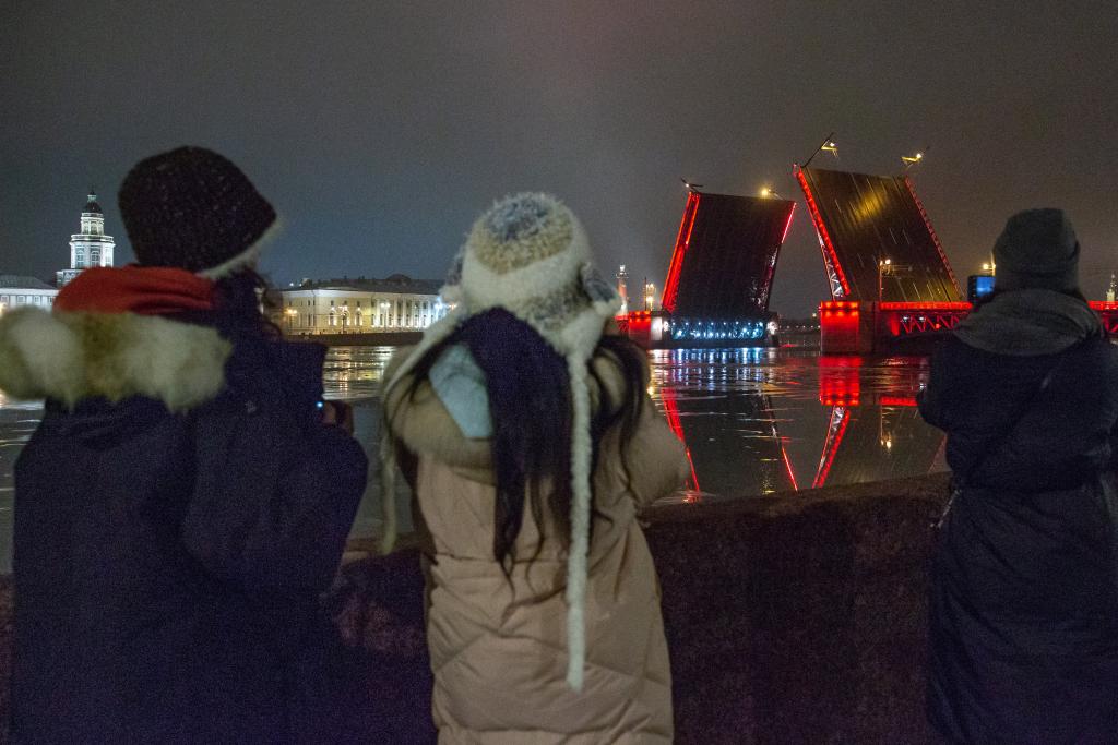 按照當(dāng)?shù)貍鹘y(tǒng),涅瓦河上的多座橋梁只在每年4月至11月通航季定時開合,以便大型船只通航?!斑@是圣彼得堡首次為外國節(jié)日開橋,特別獻給我們的中國朋友?!笔ケ说帽な袑ν怅P(guān)系委員會主席格里戈里耶夫說。