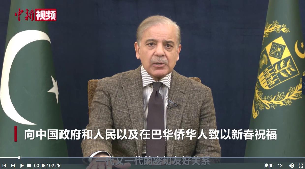 當(dāng)?shù)貢r(shí)間1月28日,巴基斯坦總理夏巴茲發(fā)表視頻致辭,向中國(guó)政府和人民以及在巴華僑華人致以新春祝福,表示巴方將繼續(xù)與中方攜手為全球和平、繁榮與和諧作出貢獻(xiàn)。(記者 薄雯雯制作 徐妙巧 視頻來(lái)源 巴基斯坦駐華大使館)
