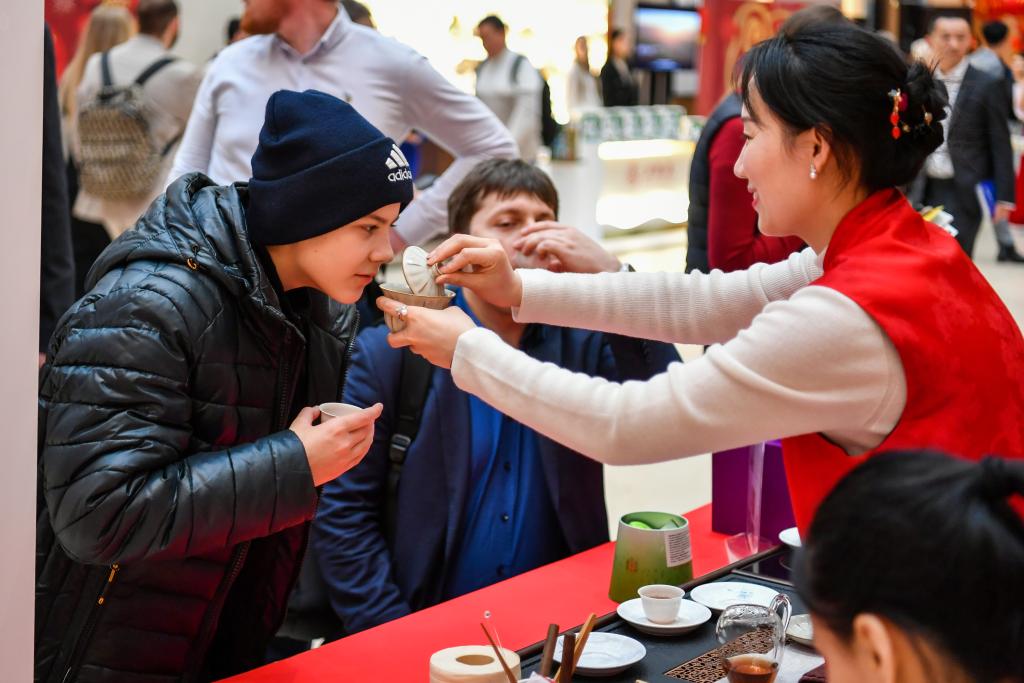 2025年1月28日,在俄羅斯莫斯科舉行的新春廟會(huì)活動(dòng)上,游客在感受茶文化。新華社記者曹陽(yáng)攝