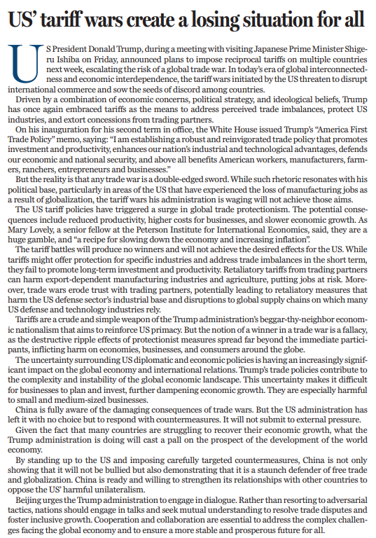 上周五,美國總統(tǒng)特朗普在會見到訪的日本首相石破茂時宣布,下周將向多個國家征收“對等關(guān)稅”。由此,全球貿(mào)易戰(zhàn)風(fēng)險升級。當(dāng)今,世界互聯(lián)互通,經(jīng)濟(jì)相互依存,美國發(fā)起的關(guān)稅戰(zhàn)或?qū)_亂國際貿(mào)易,使得各國心生間隙。