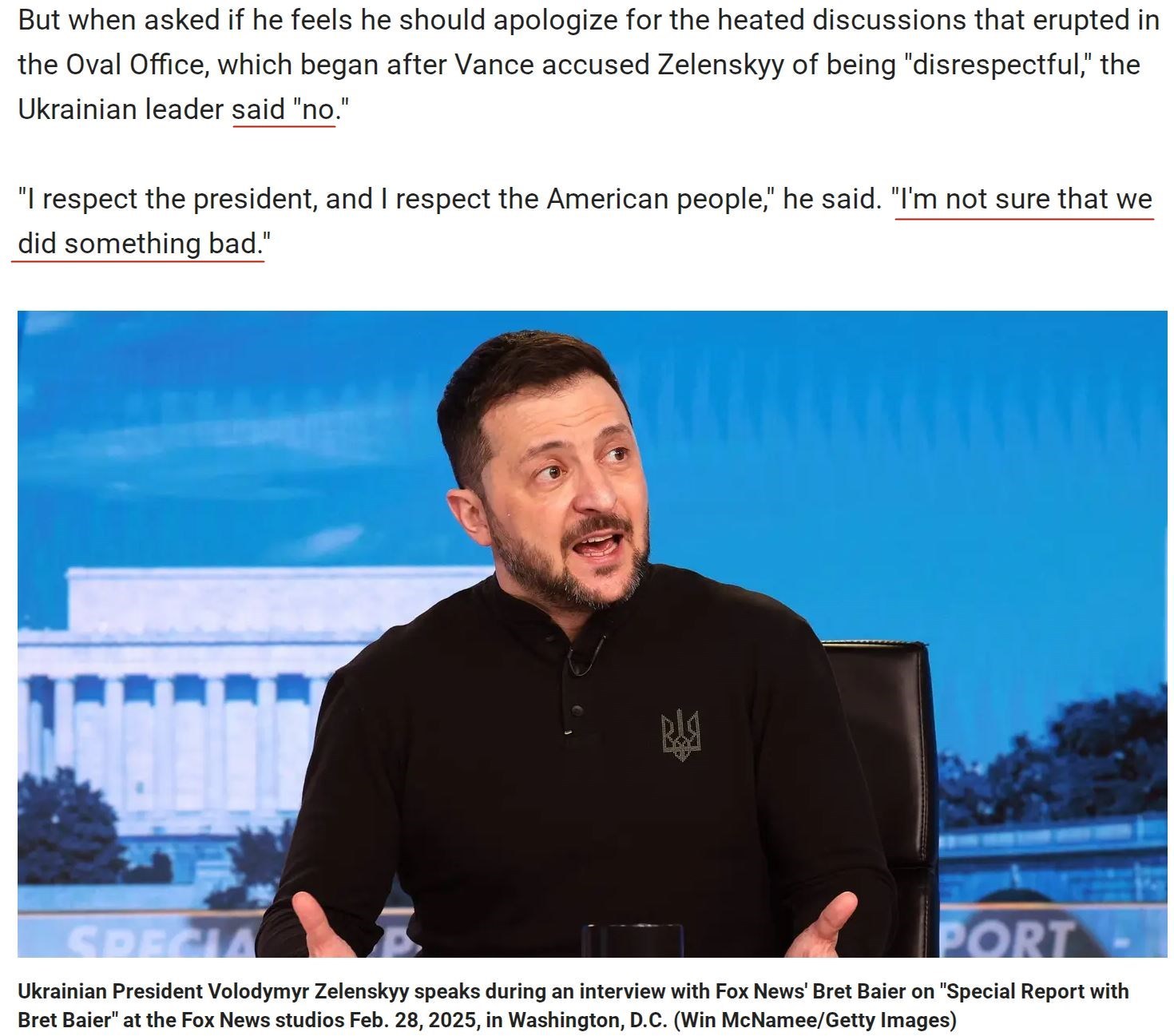 “我在橢圓形辦公室看到的是(澤連斯基對(duì)美國(guó)的)不尊重。我不知道我們能不能與澤連斯基恢復(fù)談判。還是那句話(huà),他要么辭職,然后派一個(gè)可以與我們合作的人過(guò)來(lái),要么他自己做出改變?!?/p>